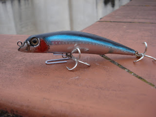 En mi ultima salida al roquero, me encontre este señuelo, un darter, bastante deteriorado en la pintura , o sea que al taller, perdon por no sacar fotos de su deterioro pero es que a veces se me pasan las cosas y corro demasiado, sin romperme mucho el coco con la librea me decido por todo un clasico , el sardina.